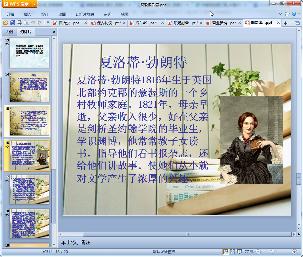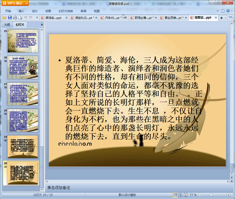 这是我们东坡下载为大家准备的一篇简爱读后感ppt,内容比较精美全篇ppt共有20页,有需要准备这简爱读后感ppt类型文档的朋友可以直接点击下面的地址免费的下载这篇简爱读后感ppt!