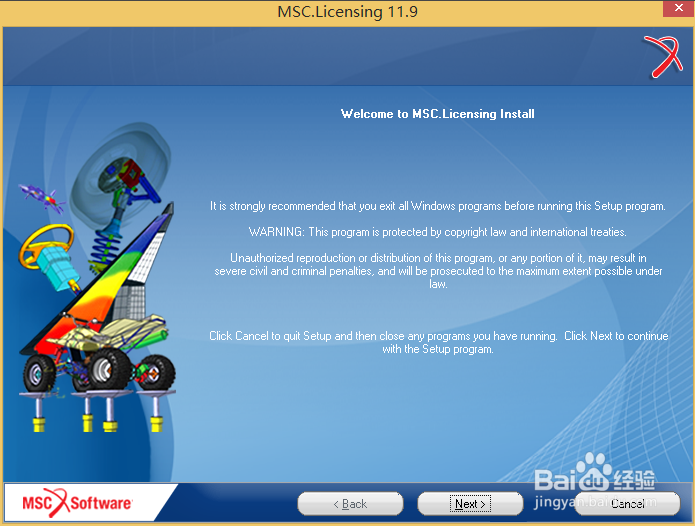 如果你勾选了,会发现里面告诉你,win7环境下是需要在管理员权限下安装的,很多人在之前生成license.dat文件和安装MSC.Licensing时都记得在管理员权限下进行,但是到了安装主程序,反而忘记了,认为不需要,这样就会造成adams没反应的后果。