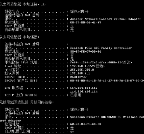 最后再说一个物理IP地址的问题,对于有多网卡或者装有Juniper Network Connect的电脑,要选中真正使用的地址,如我的电脑有很多以太网适配器: