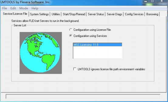 “开始”→“MSC.Software”→“MSC.Licensing 11.9”→“MSC.Licensing Utility”,弹出图示窗口,选择从右边数第二个选项卡“Config Services”。
