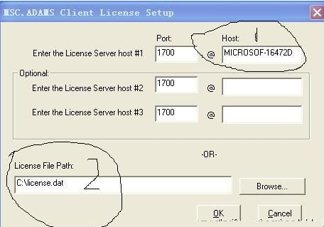 开始->所有程序->MSC.Software->MSC.ADAMS 2005->ADAMS - license Setup。在1中填入主机名称,在2中填入C:\license.dat。点图2中的OK后出现如图3所示的提示,点击其中的OK即可。