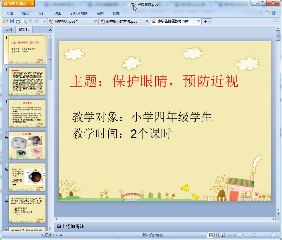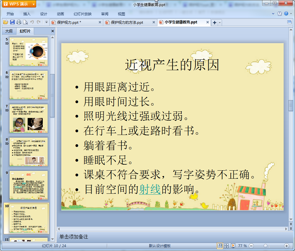 1、世界上青少年视力不良的比率一直居高不下,甚至有上升的趋势,电脑、电视、课业让我们使用眼睛更加频繁了,但我们却常常忽略它的需求,经常超时工作,我们身为教师必须随时提醒学生留意用眼卫生和用眼习惯,重视对眼睛的保护。