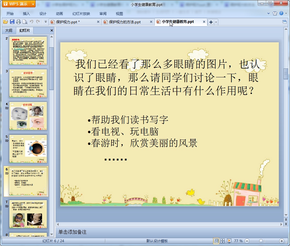 技能目标:养成良好的健康态度和卫生习惯并能在生活中表现,做好眼保健操,能做到望远凝视,了解眼睛的保健方法。