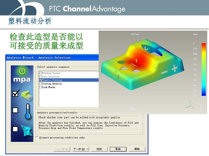 Plastic Advisor ( 塑料顾问) 是Pro/Engineer Wildfire自带的一种具强大的分析、计算和动态仿真功能的模流分析模块,主要用于塑件在模具型腔内注射成型分析,用户可直观地观测塑料融体的流动情况、塑件的填充状态、注射力的变化情况等,并得到可靠的反馈信息和建议,从而使零件和模具在设计阶段就能得到完善与改进,达到用户的设计要求和最终使用目的。