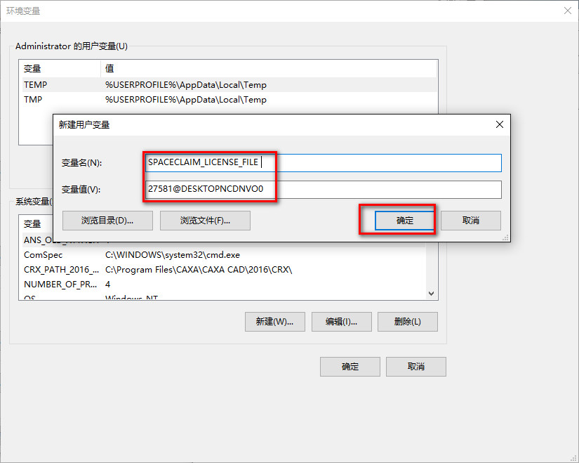 18.在“系统变量”中点击“新建”.变量名为:SPACECLAIM_LICENSE_FILE。 变量值为:27581@你的计算机名.例如小编计算机名为:DESKTOPNCDNVO0.所以变量值就设为:27581@DESKTOPNCDNVO0最后点击“确定”。如下图