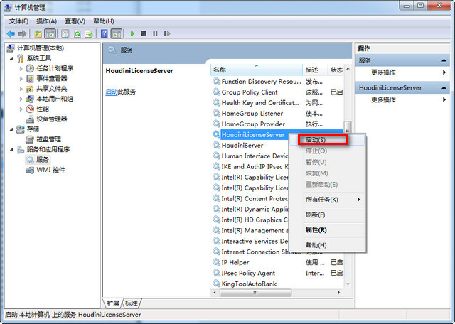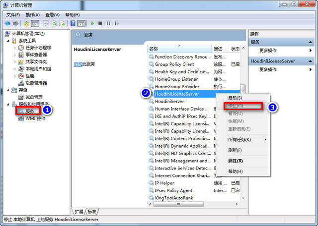 7.这时候软件就安装完成了,接下来要对软件破解。依次选择我的电脑--右击管理--打开服务,找到“HoudiniLicenseServer”此项,右击停止服务;如下图: