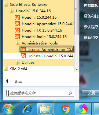 10.在开始菜单,找到houdini15的快捷菜单,运行“license administrator”;