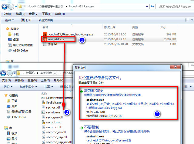 8.然后加压Houdini15 keygen破解文件并复制文件夹中的“sesineted.exe”到C:\Windows\System32下,覆盖原文件;如下图