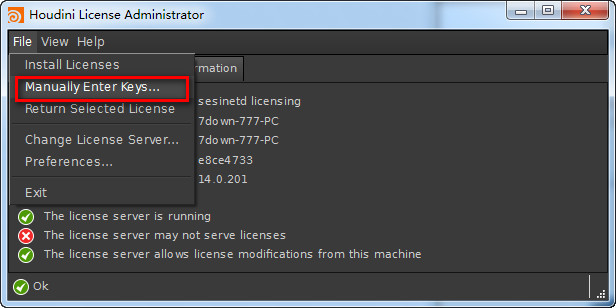13.返回license administrator ,依次点击file—manually enter keys手动填写注册码菜单.注意:一行一行的拷贝,每一行代表一个注册码,有多少行,就要输入多少次.如下图