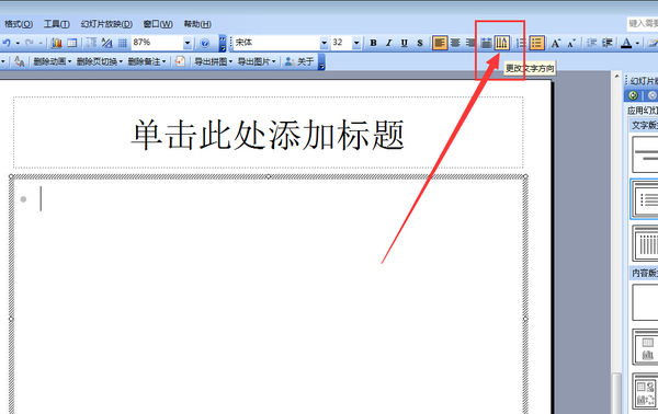 1、点击插入文字的区域,然后点击上方工具栏里面的“更改文字方向”。