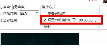 2、进入切换后,可以看到菜单栏最后面的“换片方式、时间设置”等。设置每张幻灯片自动播放的时间为5秒,那么就可以设置00:05:00.