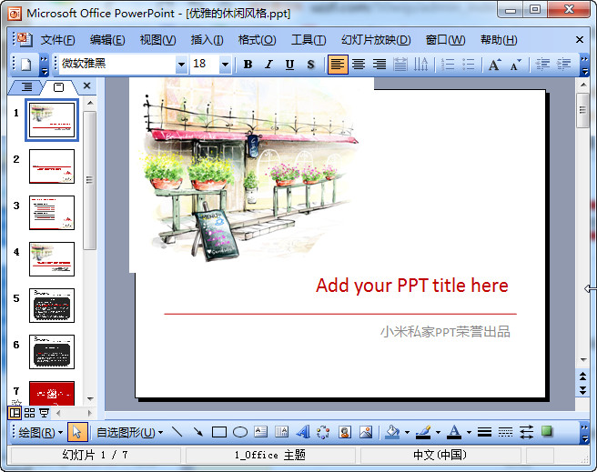 优雅休闲风格ppt模板,一份小米私家出品的ppt模板,非常适合用来做旅游、学习、简历等方面的ppt模板,以简单的花架、院子为题,突出一种淡然优雅的感觉,也就是闲暇的午后时光,欢迎有需要的朋友前来东坡下载使用!