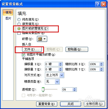 2、在弹出的设置背景格式对话框的填充选项中,选择图片或纹理填充,然后单击文件按钮。