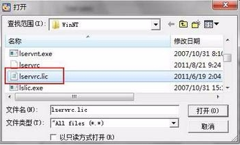 弹出此对话框,下拉找到lservrc.lic,选定后点打开