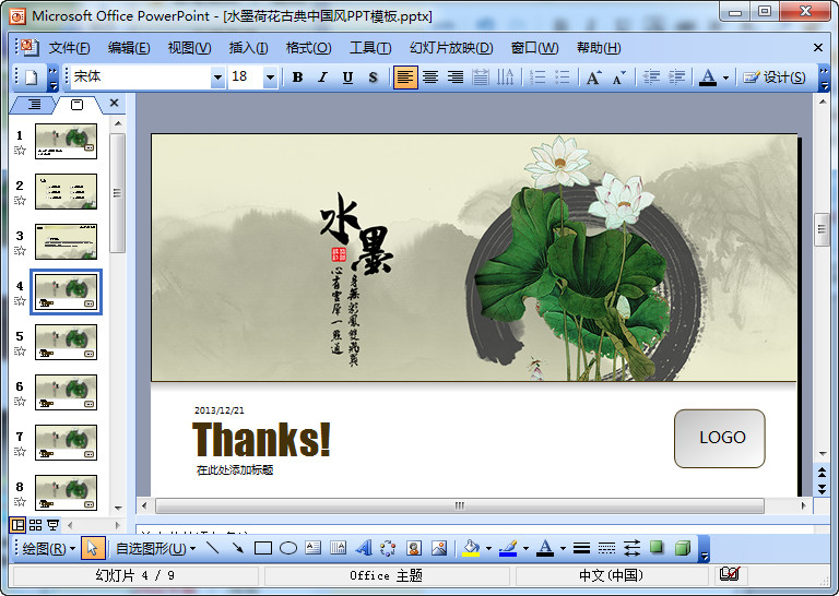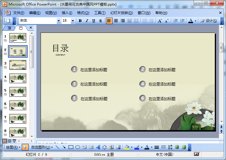 今天东坡小编为大家带来了一份完美的水墨荷花古典中国风ppt模板,里面有着漂亮的荷花,淡粉色的荷花被养在水池当中,绿色的荷叶衬托着它,一圈黑色的墨水围绕着这一株荷花荷叶,一尾小金鱼突破了墨水在水中游弋,十分的有趣!