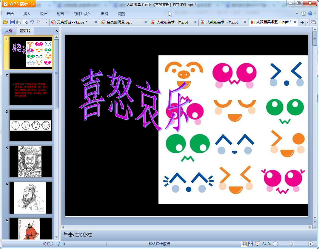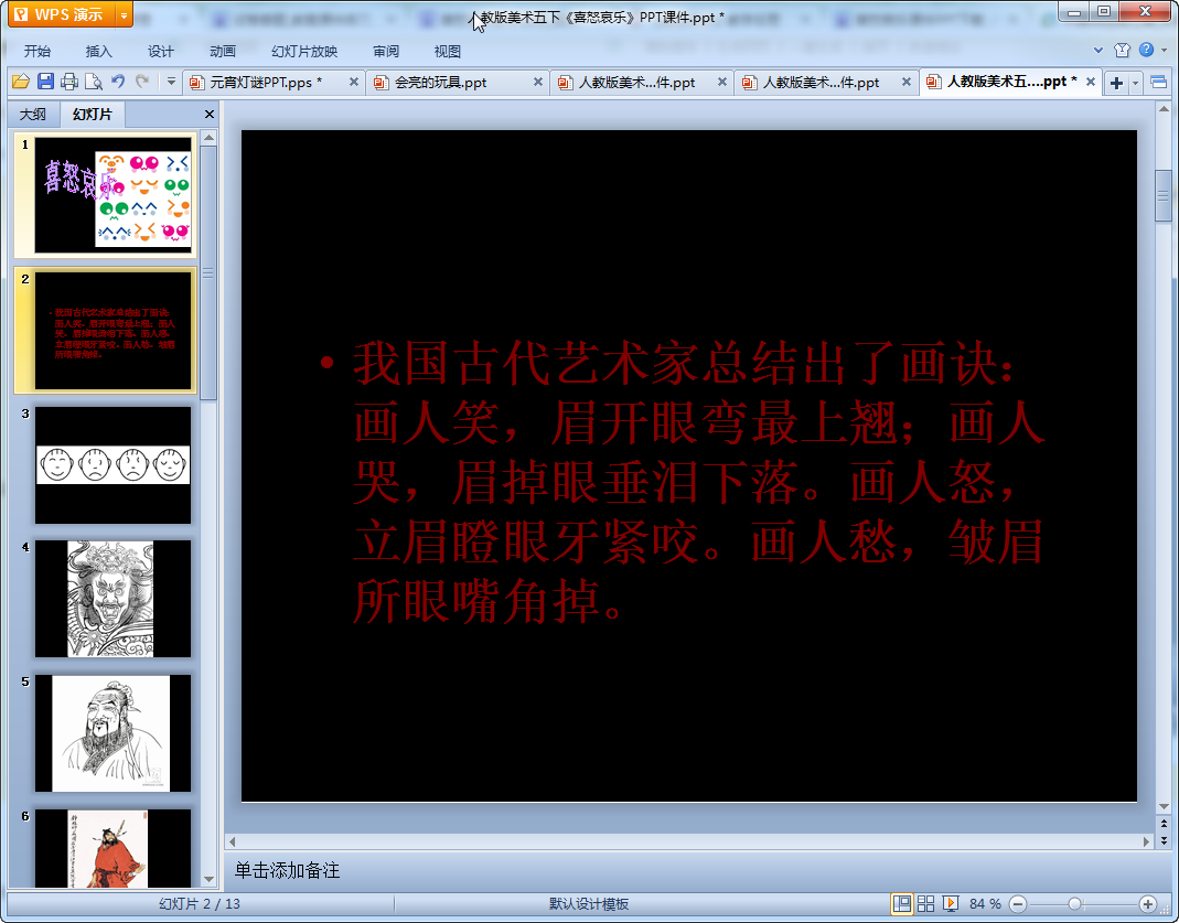 ?喜怒哀乐是一节绘画课,教学本课的目的是通过教学让学生了解人的表情变化及规律,并尝试用夸张的手法来表现人物的不同神态。这有一定的难度,因为对六年级的学生来说,他们对表现开心、快乐的心情比较多,而对表现哀愁、愤怒的情绪缺乏经验,为了使学生全面的了解、掌握人的表情变化规律,我在整堂课中正确把握方向,突出重点,由浅入深、循序渐进,讲解到位。整堂课从听音乐猜表情到看眼神猜表情;从玩一玩、讲一讲、贴一贴到读一读;从色彩感知到作品欣赏;从 课堂练习到作业讲评,无不体现课堂结构的严密性,营造情境自然流畅,环节设计有创意,体现了很深的教学理念,课堂中采用了各种有趣的教学方法,让学生主动参与、乐于探究、勤于动手,大力关注学生的学习兴趣和能力培养,学生作品完整、美观,让人感到耳目一新。