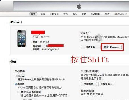 3、还有第三种,当iphone手机锁屏密码忘记后,最有效的解决办法是重新刷机。此时只需要将iphone手机通过数据线与电脑相连,然后打开iTunes,在按住Shift键的同时点击“恢复iphone”按钮。