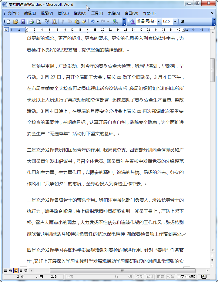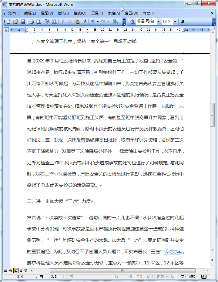 本人任职以来能够经常深入井下检查指导工作,解决安全生产方面的问题,对重大问题的隐患追究、协助矿领导做好安全工作。虽然,自己在以往的工作中取得了一些成绩,但与领导的要求还相差一定距离,在以后的工作中,我会不负领导重托,不断提高自身素质,为矿井长治久安,发出自己的光和热,为矿井多做贡献。