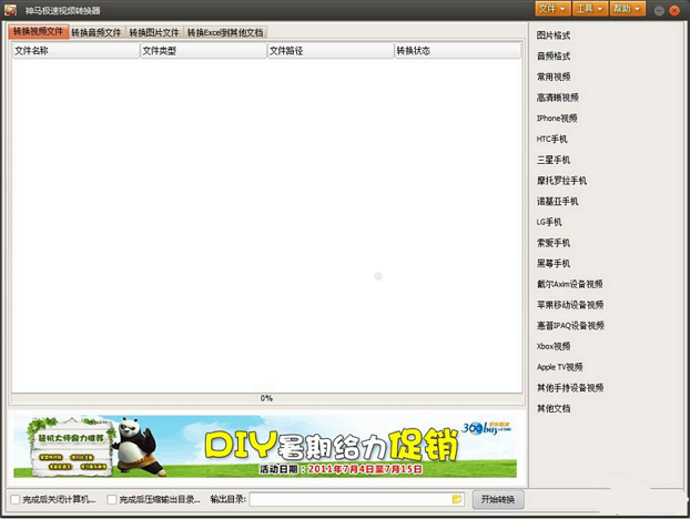 可以转换任何格式的视频文件,如:RM、RMVB、VOB、DAT、VCD、 MKV、DVD、SVCD、ASF、MOV、QT、MPEG、WMV、 MP4、3GP、DivX、XviD、AVI、等视频文件,编辑转换!