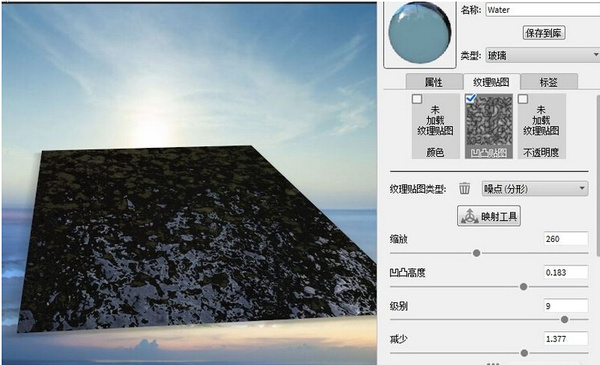 2、上面的平面赋予玻璃材质,使用噪点程序贴图类型,并调整合适参数。