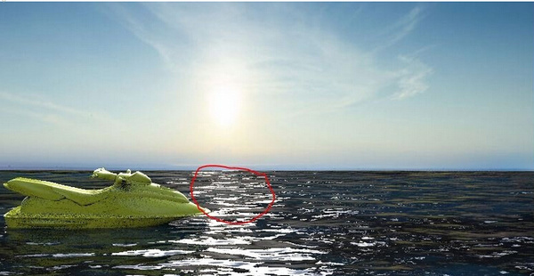 6、到此为止效果基本模拟出来了,但是大家可以看到图中红圈位置实际上应该有很强的太阳的倒影,但是由于没有那么合适的HDR和角度,很难得到那样的效果。