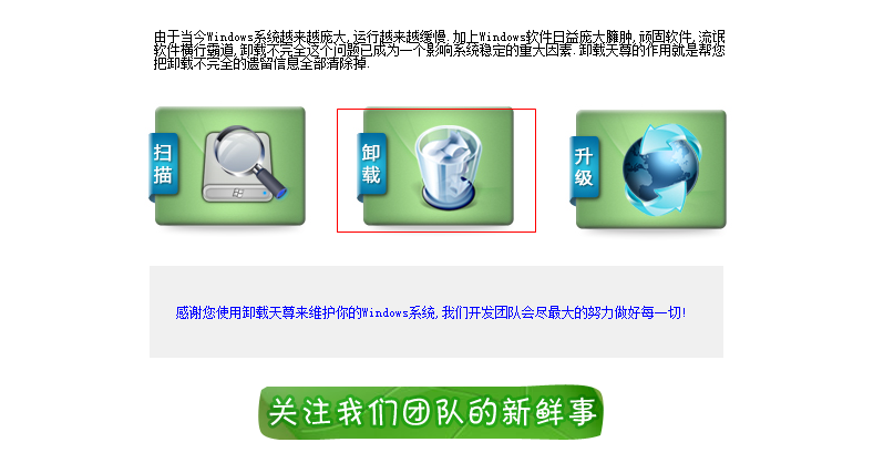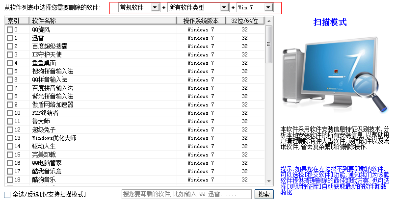 扫描:采用软件安装住处特征识别技术,分析已安装软件的所有安装信息,以帮助用户清理删除各种大型软件,顽固软件以及流氓软件,省去复杂繁琐的删除操作。