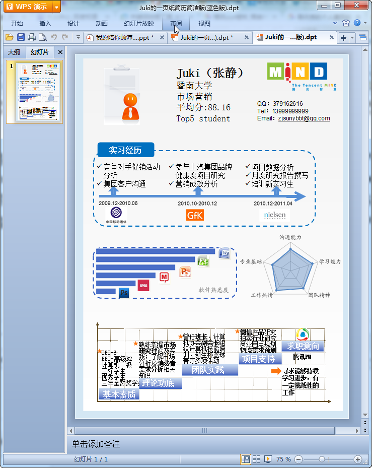 个人简历是求职者给招聘单位发的一份简要介绍。包含自己的基本信息:姓名、性别、年龄、民族、籍贯、政治面貌、学历、联系方式,以及自我评价、工作经历、学习经历、荣誉与成就、求职愿望、对这份工作的简要理解等。