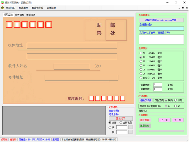 本软件界面简洁、操作方便,收信人的邮政编码、地址、姓名,既可以手工输入、逐一打印;也可以保存在access或excel中,一次性导入到软件中批量打印,高效快捷、省时省力。