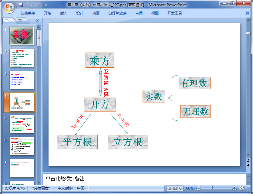 人教版七年级数学下册第六章是实数,课程结束后需要做一个总复习,这里就给大家分享第六章实数复习ppt课件,主要复习了有理数,无理数,实数的概念,分类;让学生明确了数轴,绝对值,相反数及倒数等几个重要概念,会求一个实数的相反数与绝对值;难点是绝对值的有关化简,非负数的应用。