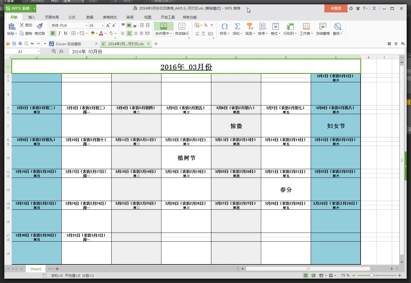 2016年3月份日历表A4电子打印版(含农历)预览