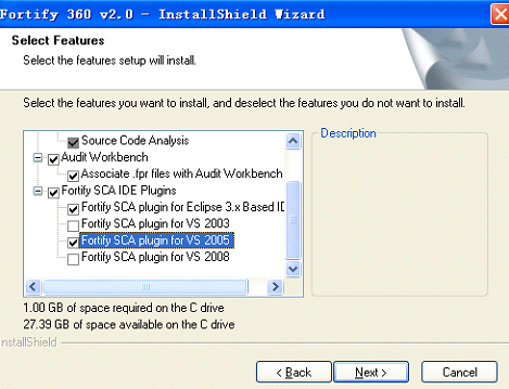 选择相应的组件进行安装,在此处请注意,fortify默认不安装IDE插件,如果需要安装相应的IDE插件,如图所示:在此处我选择了基于eclipse3.x,VS2005的插件(选择安装VS的插件之前,得首先安装VS的IDE),然后点击‘NEXT’按钮