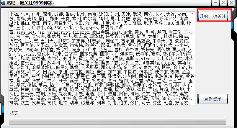 3,登录成功后,开始一键关注,里面的贴吧名字(可以自己添加,以,分割,这里是半角的",")