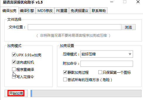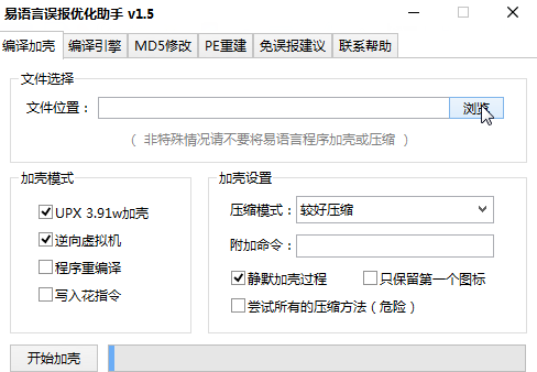 易语言误报优化助手其实就是一款非常好用的解决易语言误报的问题的软件。这款软件最大特点就具备编译文件加壳、编译文件的MD5值修改和PE输入表修改,让你们减少被误报的可能!