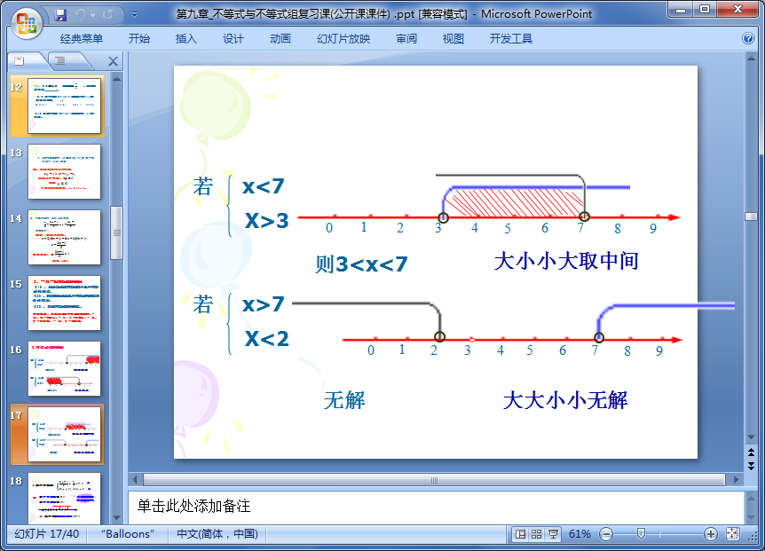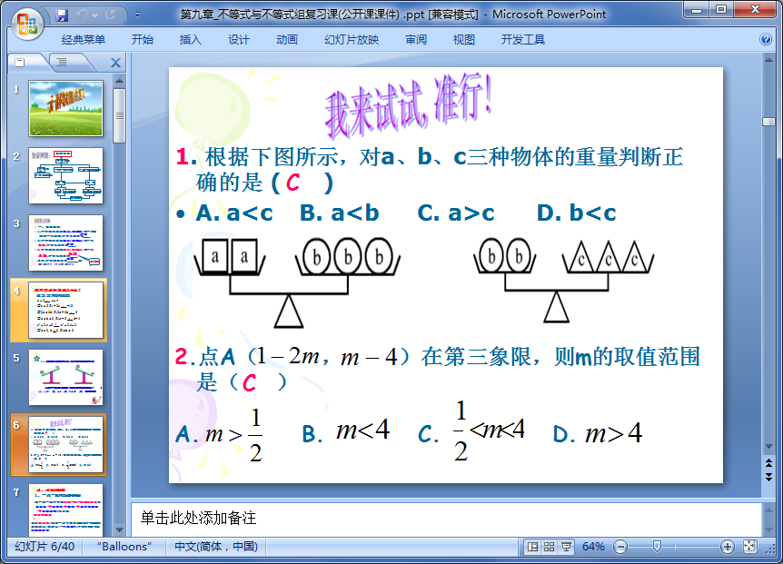 不等式与不等式组复习课是对第九章内容的复习与总结,复习学过的知识及本章有关概念 正确掌握不等式的性质,熟练地解一元一次不等式和一元一次不等式组及它们的应用。