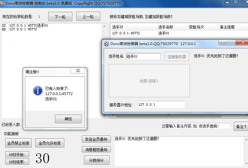 参与抢答直接按指定按钮,一旦有选手抢答,【抢答】按钮即变为灰色,阻止再次抢答。