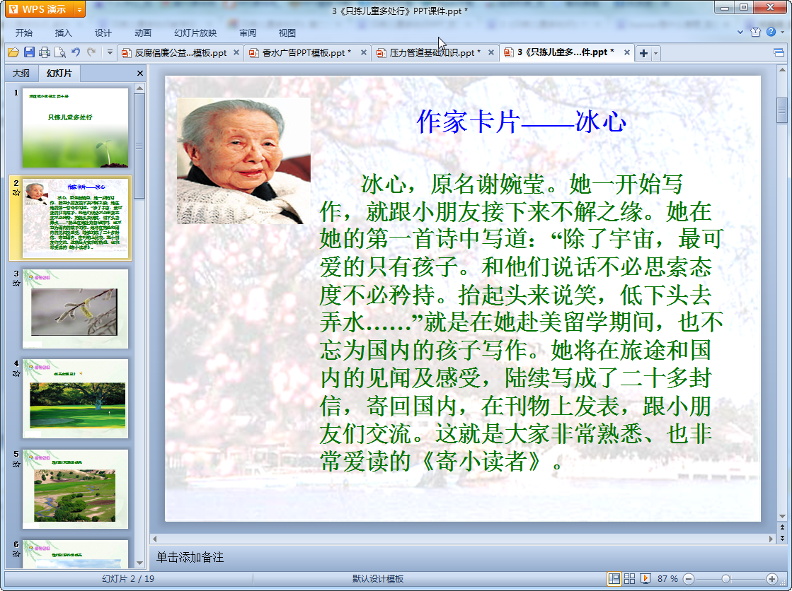 2、师过渡:孩子们真的不愧是“天才的诗人”,你们的确让人不得不喜爱。我国著名的作家冰心奶奶曾写过这样一句话,她说:“儿童是世界上最美的,除了宇宙之外,就是儿童。”孩子们,你们看,冰心奶奶给了你们多高的评价啊!现在就让我们继续来学习冰心奶奶写的散文《只拣儿童多处行》,看看在冰心奶奶眼里,儿童是什么?