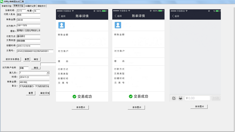 左侧编辑相关转账信息内容,然后点【确定】按钮即可生成相关图片,点击右下方【保存图片】即可保存高清大图