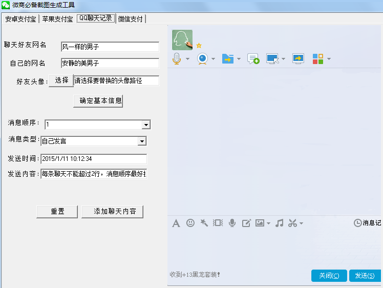 然后这个是QQ聊天记录截图:设置聊天内容,点击【添加聊天内容】,有多行就多设置一些