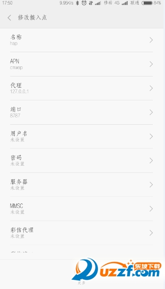 第一步:打开APN设置,新建一个接入点,名称随意,代理为127.0.0.1然后接入点端口为8787,接入点APN,移动为cmwap,联通填uniwap或3gwap,电信为ctwap