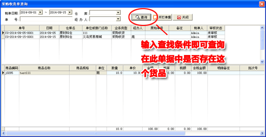 查找货品:在录制单据时,当一个单据中货品过多时,可以利用此工具来进行查询单据中是否已经录入此货品。方便用户进行查找和核对。