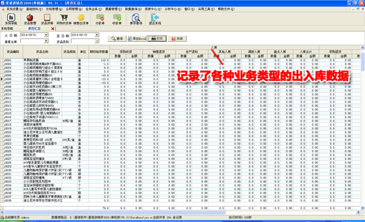 在库存汇总表中记录显示各种业务类型的出、入库数据。
