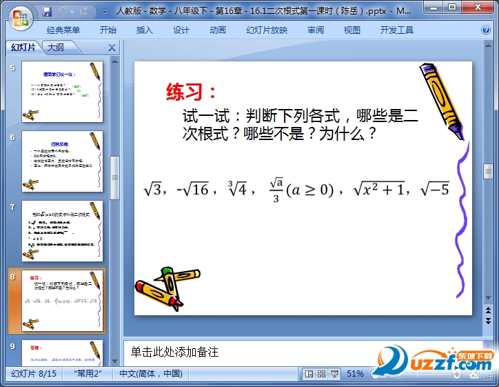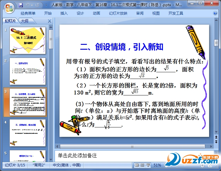 二次根式是人教版八年级数学下册的第一章内容,主要内容是二次根式的概念、性质和代数式的概念,是对前面所学知识的综合应用,也为后面学习二次根式的性质和四则运算打基础。