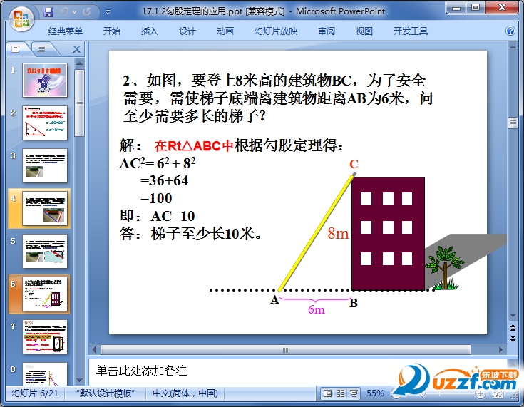 学习了勾股定理之后就要学会应用,东坡小编这里就给大家分享17.1.2勾股定理的应用ppt课件,在生产生活实际中应用很广泛.对勾股定理的探索,有助于提高学生学习兴趣。