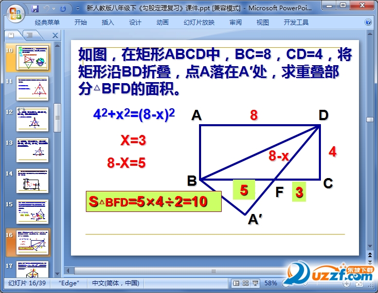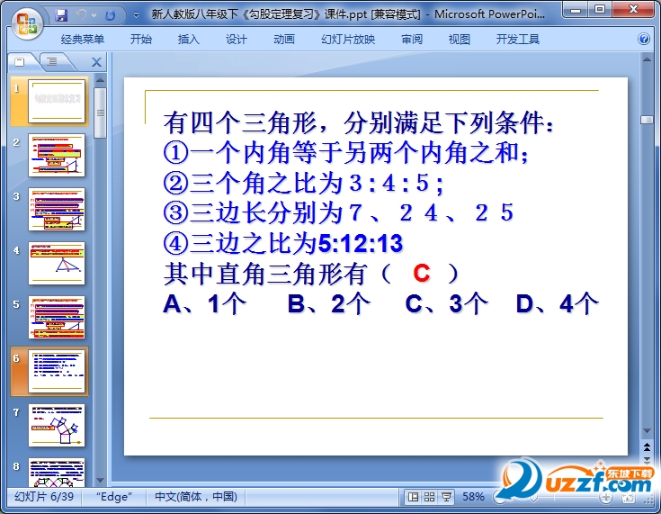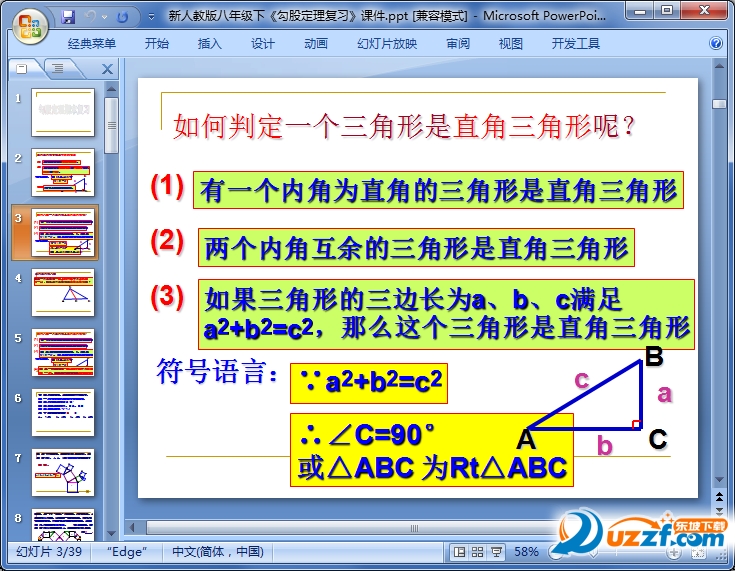第十七章勾股定理复习课件ppt是非常详细完整的课件,勾股定理是在学生已经掌握了直角三角形的有关性质的基础上进行学习的,利用勾股定理和勾股逆定理来解决实际问题。