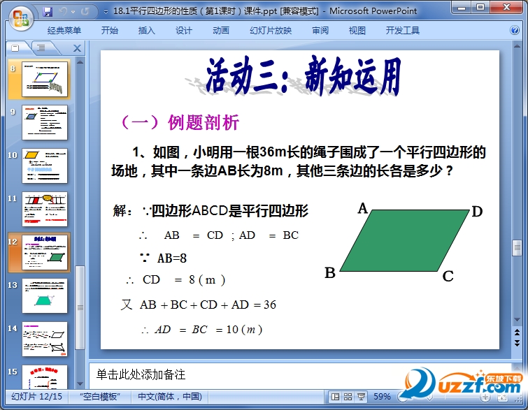 3、探究平行四边形的性质从定义入手,强调概念,由文字表达到几何语言的表达,注重循序渐进,由浅入深。