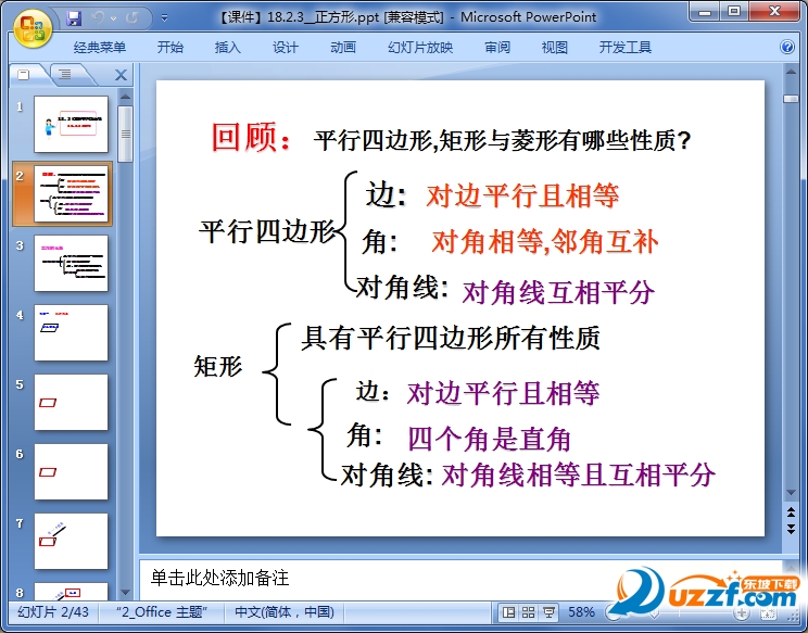 7.不足之处:展示中浪费了太多时间,学生讲解时,几何语言使用不够恰当。今后要在课堂时间掌控方面和训练学生的几何语言表达上多加努力。对于特殊四边形的一些性质,学生还没有准确记会,以后还需要多给学生些时间去背诵。