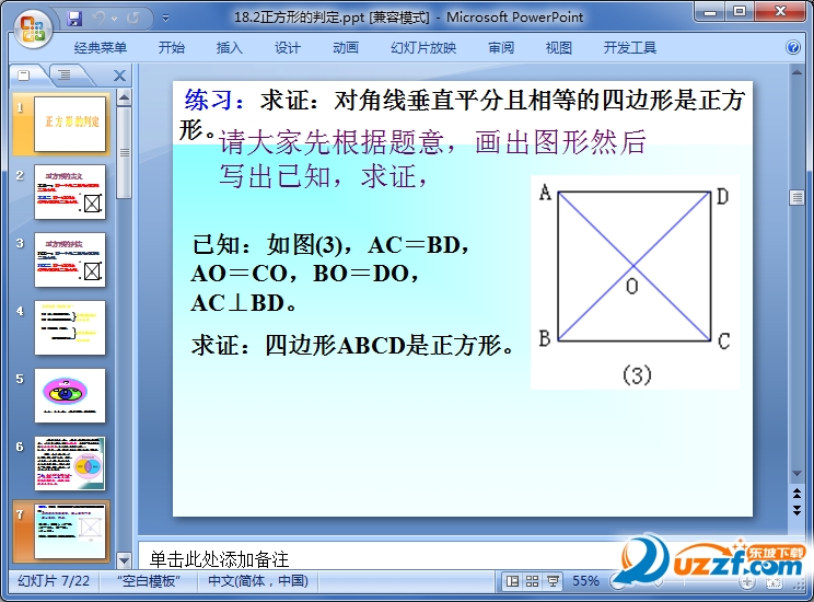 第四、详细讲解范例,主要是引导学生,对于正方形的证明的思路以及书写的格式。