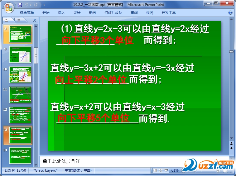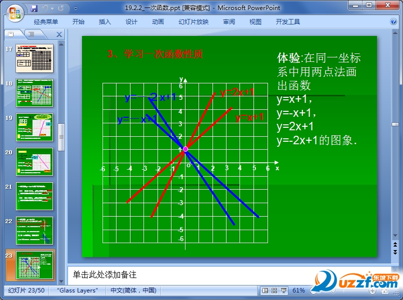 一次函数这节内容是在学习了正比例函数的概念之后进行一次函数的概念学习,理解一次函数和正比例函数的概念,通过类比的方法学习一次函数,体会数学研究方法多样性,下面分享19.2.2一次函数ppt教学课件,点击下面的地址即可进行免费下载。