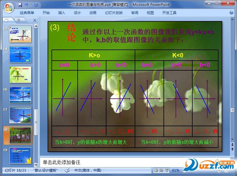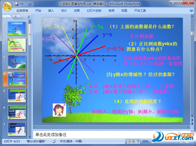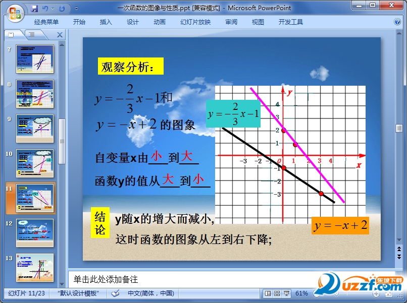 一次函数的图像和性质这节内容主要是一次函数研究函数的基本方法是由函数表达式画图象,再由图象得出性质,最后反过来由函数性质研究其图象的其他特征。东坡下载提供一次函数的图像和性质ppt教学课件,需要的朋友可以免费下载。