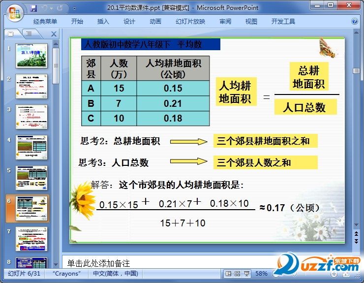 在概括得到“加权平均数”的概念之后再回到问题2,设计这样的一个问题:求得三个郊县的人均耕地面积所反映的实际意义是什么?这样设计的目的是在实际背景中引导学生体会“平均数”的统计意义.